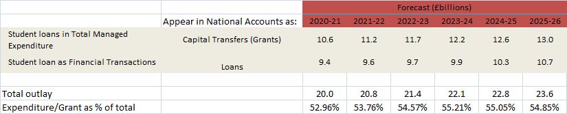 It shows how newly issued student loans are now split into two components for the purposes of presentation in the National Accounts. The portion of loans that are expected to be repaid are classed as “financial transactions”, while the portion expected to be written off is recorded as capital expenditure. The latter scores in “public sector investment”, which was adopted as a new fiscal target prior to the pandemic (net investment cannot exceed 3% of national income), though the rules are currently under review.